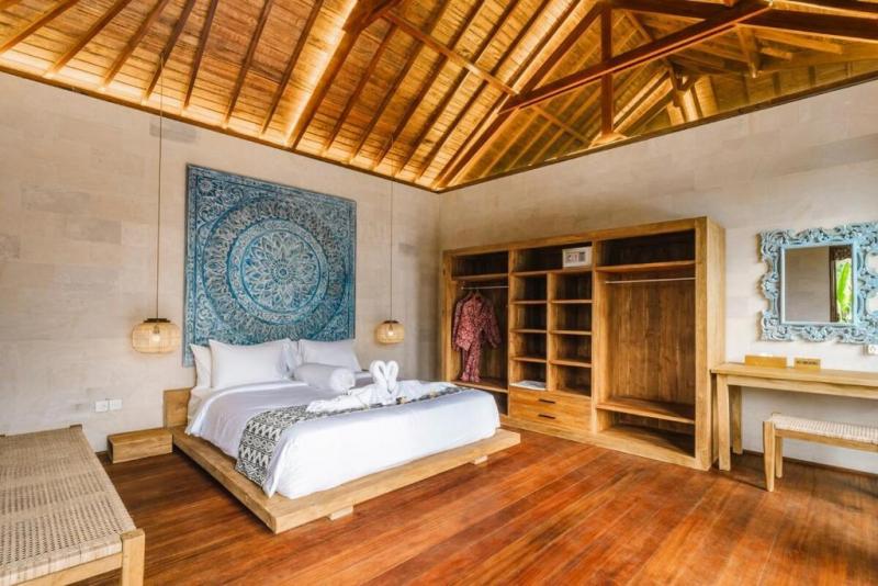 The interior layout is organized around an open-plan space integrating the living room, dining area, and kitchen, complemented by two bedrooms and two semi-open bathrooms harmoniously connected with lush vegetation. At the edge of the property, a wooden pergola serves as a viewpoint over the rice fields, offering a privileged space for contemplation.
