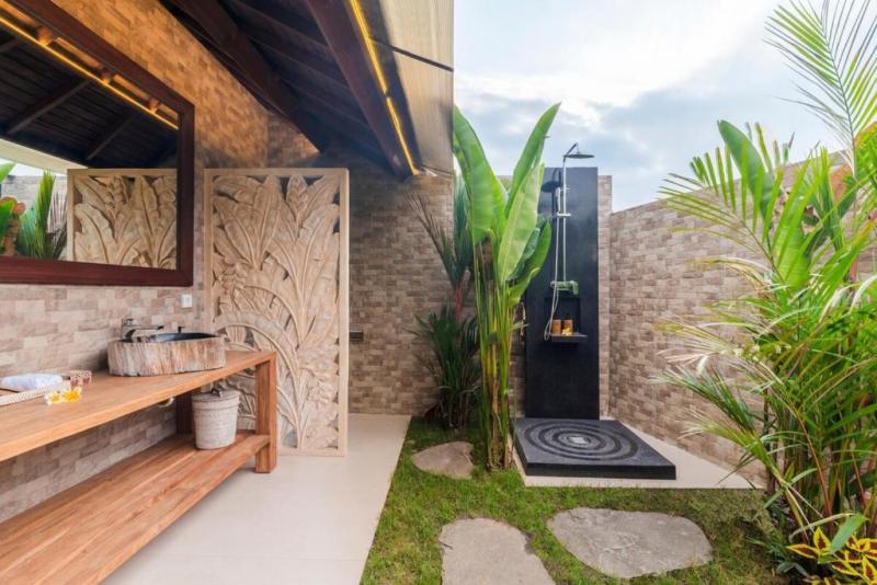 The architecture blends Indonesian materials with a contemporary tropical style: